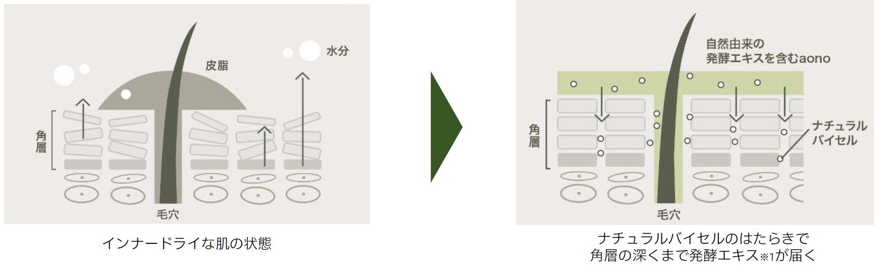 100%自然由来の原料で構成されたナチュラルバイセル※2が3種の発酵エキス※3を含んだうるおい成分を角層深くまで素早く引き込み、肌内部はうるおいが失われているのに表面はベタつく「インナードライ」な肌をみずみずしく満たします。