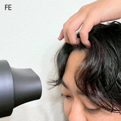 必ず髪を根元から濡らし、前髪を上に引っ張りながら温風を当てて乾かします。