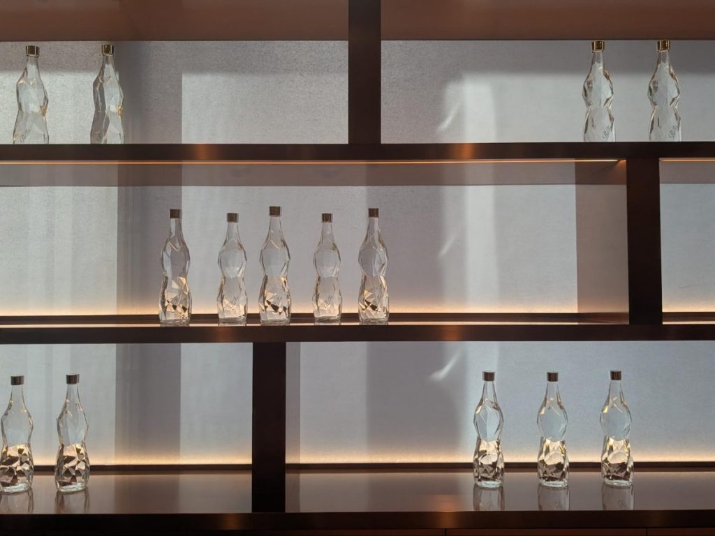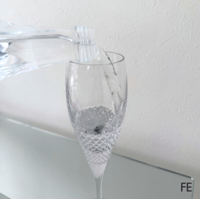 氷の彫刻のように光を反射するアート性の高いボトルで、置いてあるだけで視界が華やぎます。