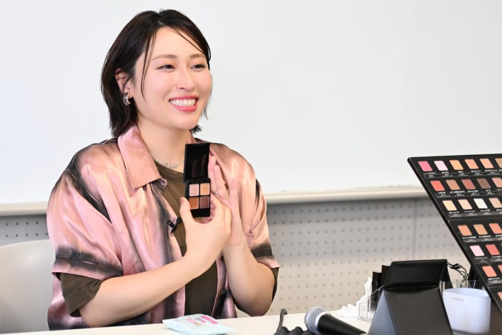 今回の特別授業には、ゲスト講師としてタレントの丸山礼さんが登場。事前に自ら選んだ“欲名”に対応する4つのアイシャドウカラーを使用し、生徒たちに向けて目元のメイクを実演しました。