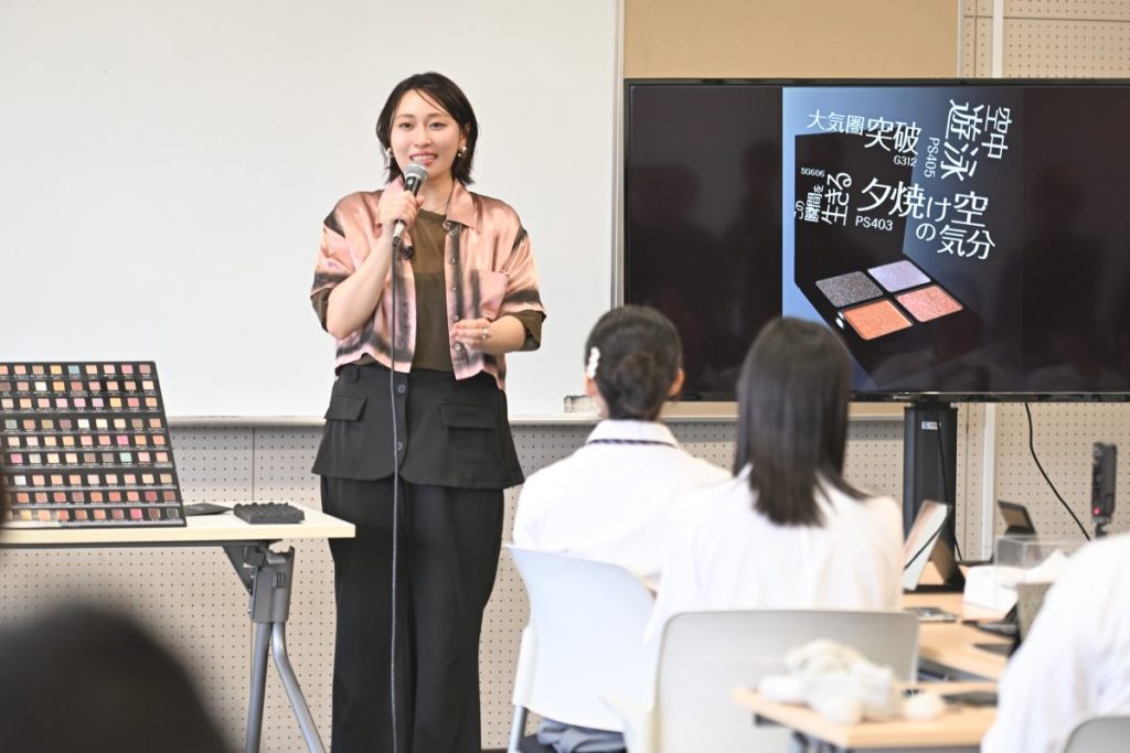 実際に丸山さんがそのアイシャドウを生徒の前で目元にのせていく場面では、教室内に緊張感と期待が漂い、生徒たちは真剣な眼差しでその手元を見つめていました。丸山さんの明るく朗らかな人柄も相まって、教室全体がやわらかく温かな空気に包まれていたのが印象的です。