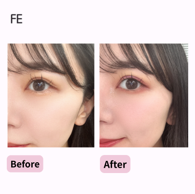 目頭と頬骨には「08 ユーフォリックグロウ」をハイライトとして使用。 肌に自然なツヤと立体感を与え、光が当たるたびにやわらかく輝きを放ちます。