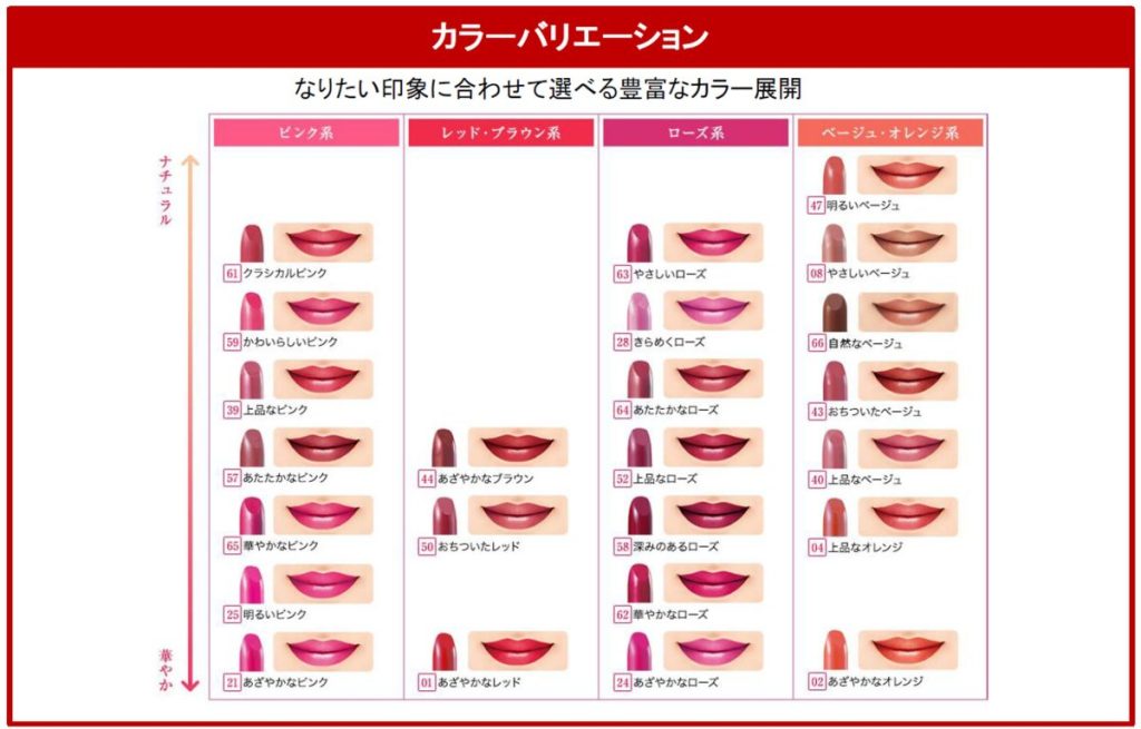 | プルーフシャイニールージュ | ローズ系、ベージュ系(全24色と豊富なため好みは分かれるが、オフィスでも使いやすい上品なカラーや、肌なじみの良い定番色が長年のファンに支持されている) |