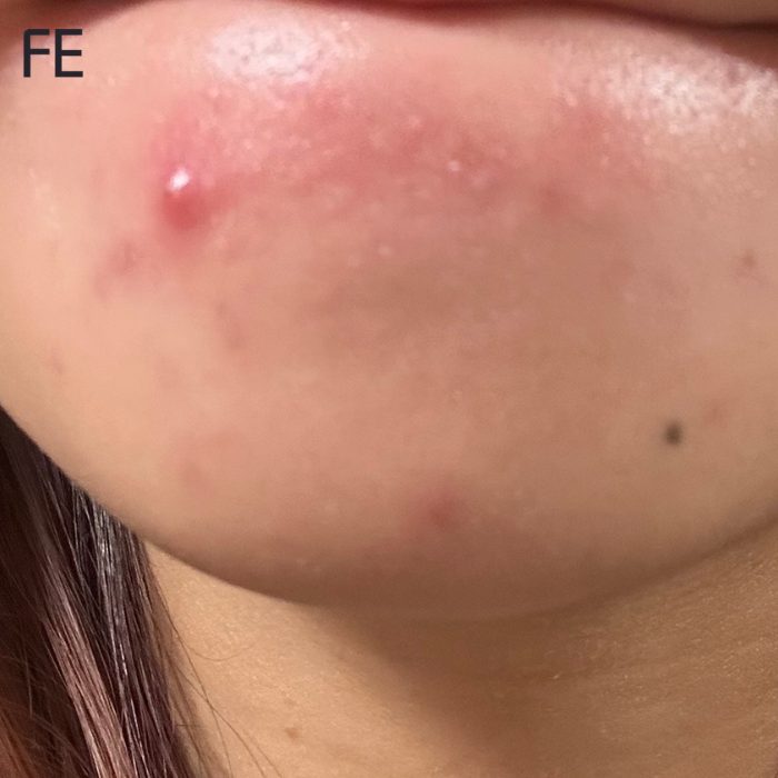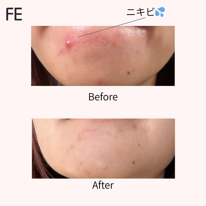 あごに繰り返しできていたニキビはすっかり落ち着き、肌治安が落ち着きました♡頬の吹き出物も追加で出ることなく、血色感とツヤが均一に出るようになったことで、肌全体がなめらかに見える印象に。