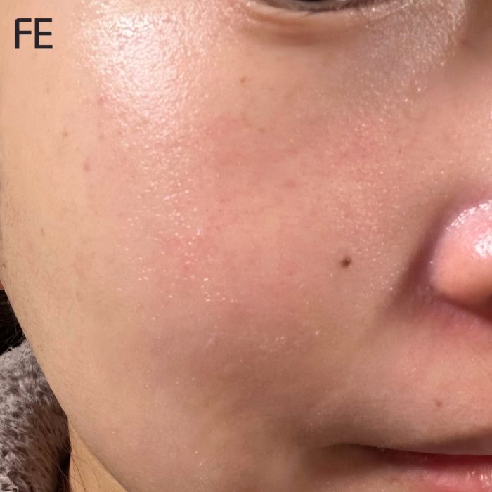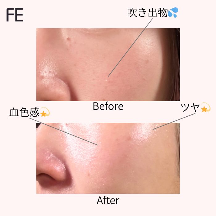筆者は混合肌で頬は乾燥しやすく、乾燥による毛穴の開きが気になる状態。また、季節の変わり目には細かい吹き出物が出ることもあり、ゆらぎやすい状態でした。