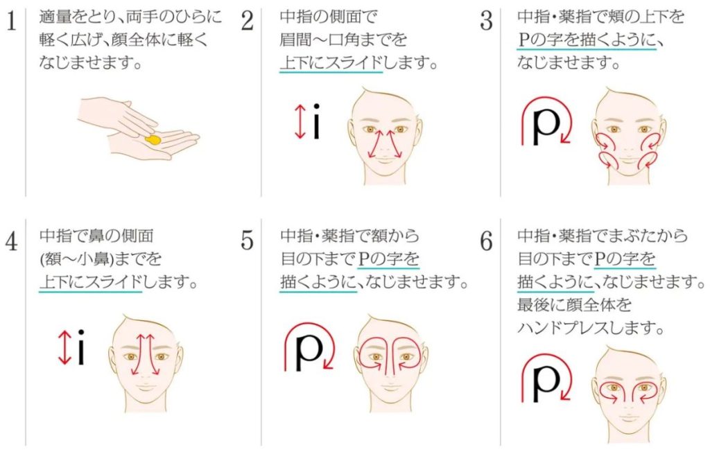 次に、適量のセラムを手に取り、上記の表の順番で顔全体に優しくなじませます。この時、肌に負担をかけないように、指の腹を使って軽く押さえるようにして塗布すると効果的です。特にくすみや黄ばみが気になる部分には、少し時間をかけて丁寧に重ねて塗り込むと良いでしょう。